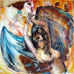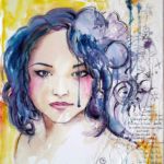 Séduite par la fluidité et la liberté qu’offre l’aquarelle, j'utilise les mêmes transparences sur mes toiles. J'ajoute à une acrylique légère les noirs profonds de l'Encre de Chine et la texture de papiers variés.